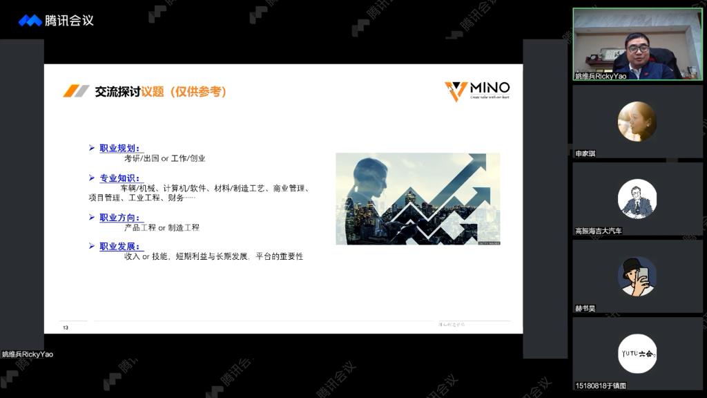 姚维兵结合自身多年的生活、学习和工作经验,以广州明珞装备股份有限公司的数字化转型为切入点,为同学们讲解了汽车行业商业模式的演变。随后,以特斯拉电动汽车及能源公司为例,从企业类型、企业产能、车型和部分行业创新技术等多个方面对新能源汽车行业的发展趋势进行系统阐释。会上,针对同学们在职业规划、专业知识、职业方向及选择等方面的问题,姚维兵从行业发展、个人选择等多个角度逐一解答,与员工们热情互动交流。他表示,青年员工在学好本专业的同时,也要注重学习艺术、管理、语言等其他学科知识,汲取交叉学科中丰富的知识内涵,提升自身的综合能力,培养良好的专业素养。最后,他鼓励同学们要以积极的心态面对疫情,在未来发展的道路上要坚定选择,百折不挠,求实创新,为新能源汽车行业的发展添砖加瓦。