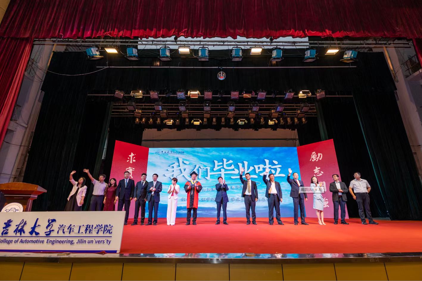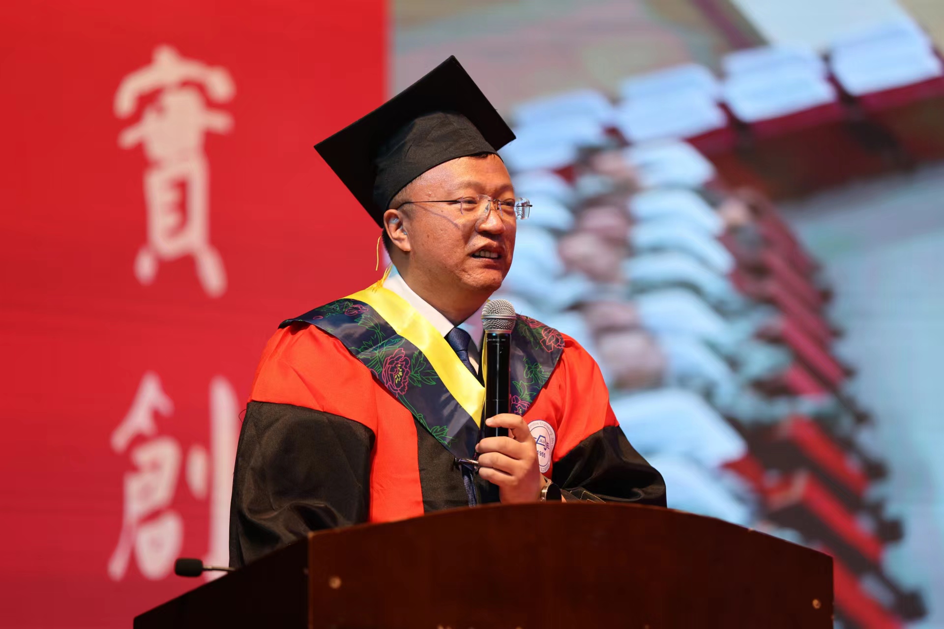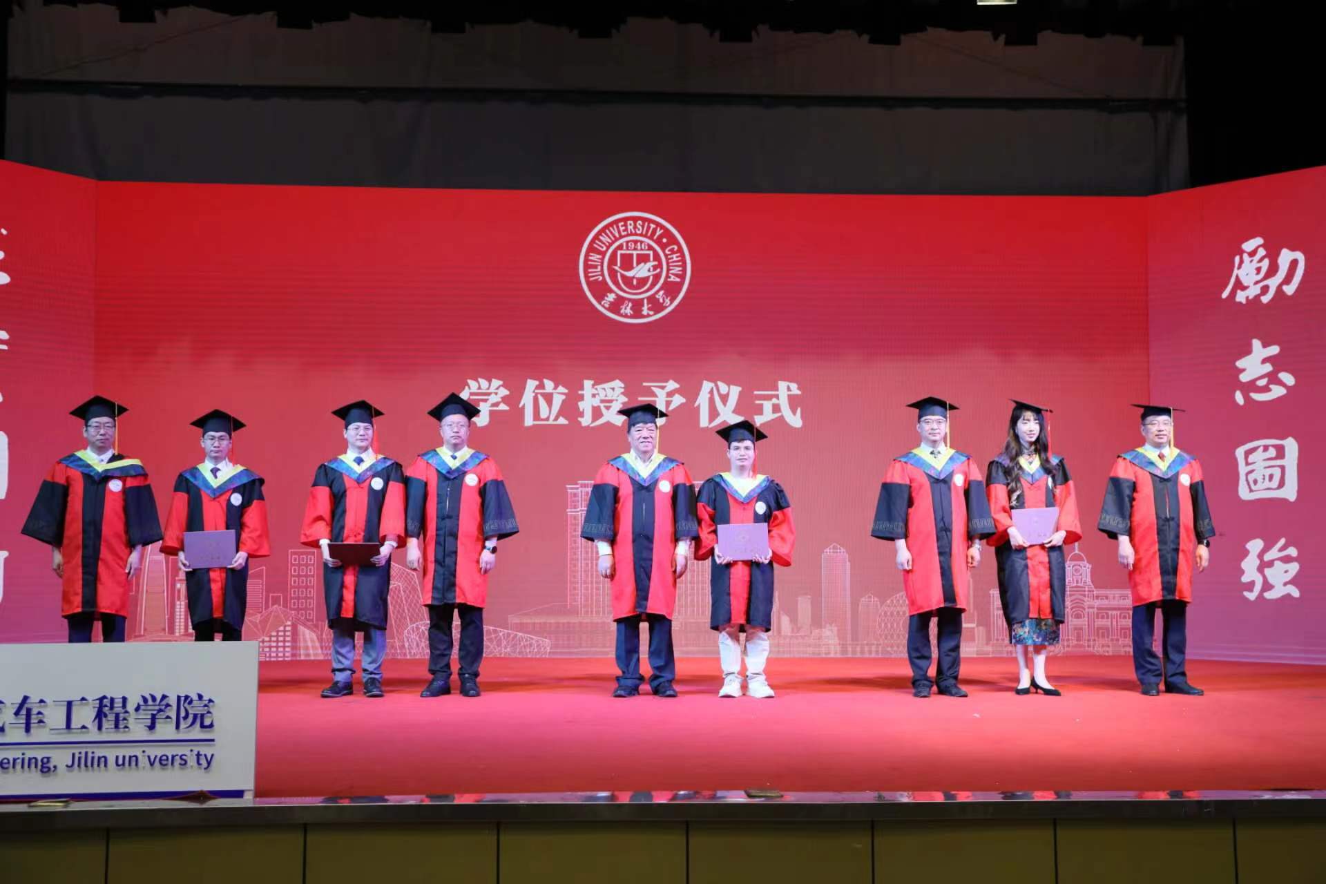 副经理胡兴军老师宣读《关于2023届毕业和授予学位的决定》,经理高振海教授,学位评定委员会主任宋传学教授、副经理王忠恕教授、胡兴军教授、朱冰教授为在场毕业生代表拨穗正冠,颁发学位证书并合影留念。