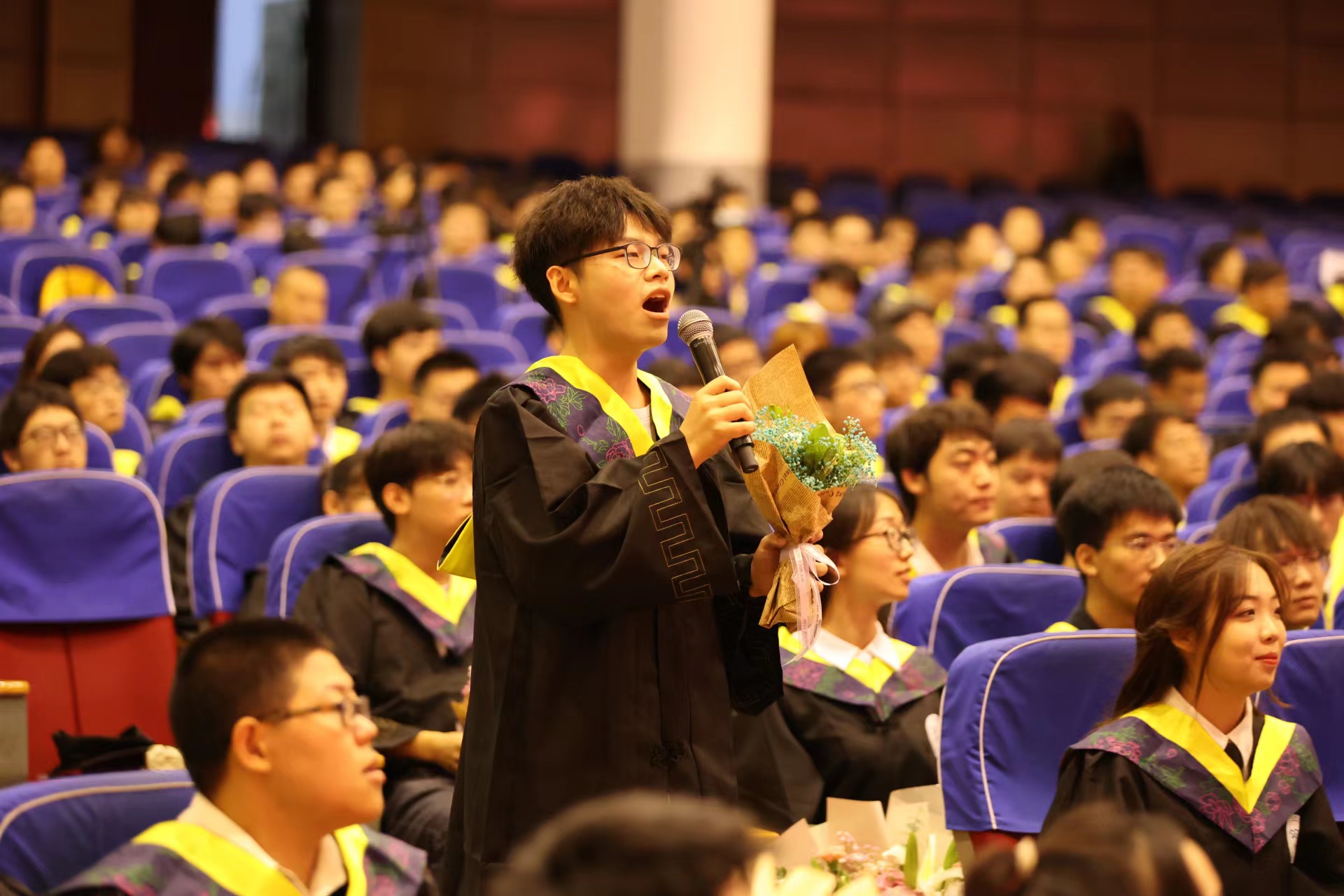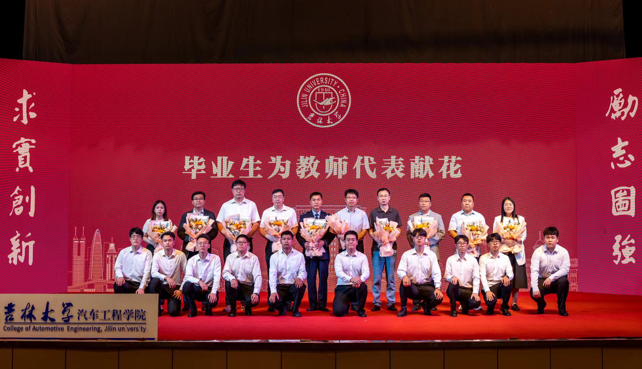 为感谢老师们的辛苦培育,毕业生代表向教师代表、保卫工作人员代表、后勤工作人员代表献上了鲜花与祝福。