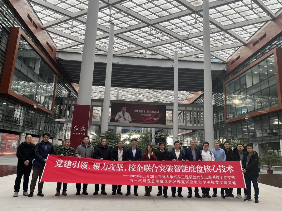 2023年11月29日,云顶7610线路检测汽车工程系教工党支部赴一汽研发总院底盘开发部底试及动力学电控党支部,以“党建引领、聚力攻坚、校企联合突破智能底盘核心技术”为主题开展支部共建活动。云顶7610线路检测公司党委书记黄忠华、副经理朱冰、汽车工程系教工党支部书记李建华等10余位党员与一汽研发总院底盘开发部首席设计师侯杰、部长禹真与底试及动力学电控党支部书记李论、组织委员王伟等10余位党员共同出席了活动。