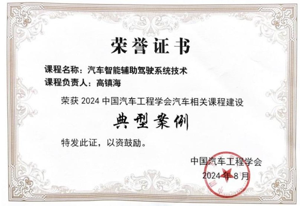 2024年8月,云顶7610线路检测高镇海教授、胡宏宇教授、孙天骏副教授联合开设的“汽车智能辅助驾驶系统技术”课程荣获2024中国汽车工程学会汽车相关课程建设典型案例奖。该奖项是由中国汽车工程学会于2023年首次设立,面向全国高等院校进行汽车相关课程建设案例征集,并将优秀典型案例在全国汽车行业人才培养经理论坛上进行现场展示。