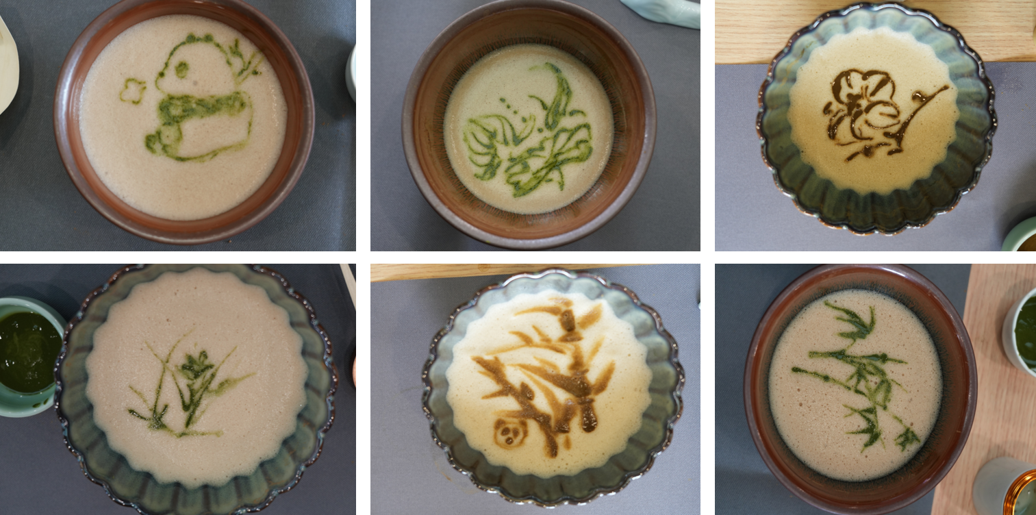 活动现场化身宋代美学空间,素雅茶席间陈列着建盏、茶筅、汤瓶等仿古器具。国家级茶艺师以《萧翼赚兰亭》《调琴啜茗图》等传世名画为引,娓娓道出宋代点茶文化的千年风韵,解密"十二先生"茶具的匠心密码。在专业指导下,老师们手执竹筅,循着七汤点茶古法,从"疏星皎月"到"珠玑磊落",茶汤逐渐泛起细腻绵密的云沫,氤氲茶香中浮现东方美学的诗意轮廓。茶百戏创意环节更是妙趣横生,大家以茶为墨,在茶汤画布上勾勒出翠竹、兰花、牡丹、锦鲤、熊猫等灵动图案,方寸之间尽显工科女老师们的艺术巧思。