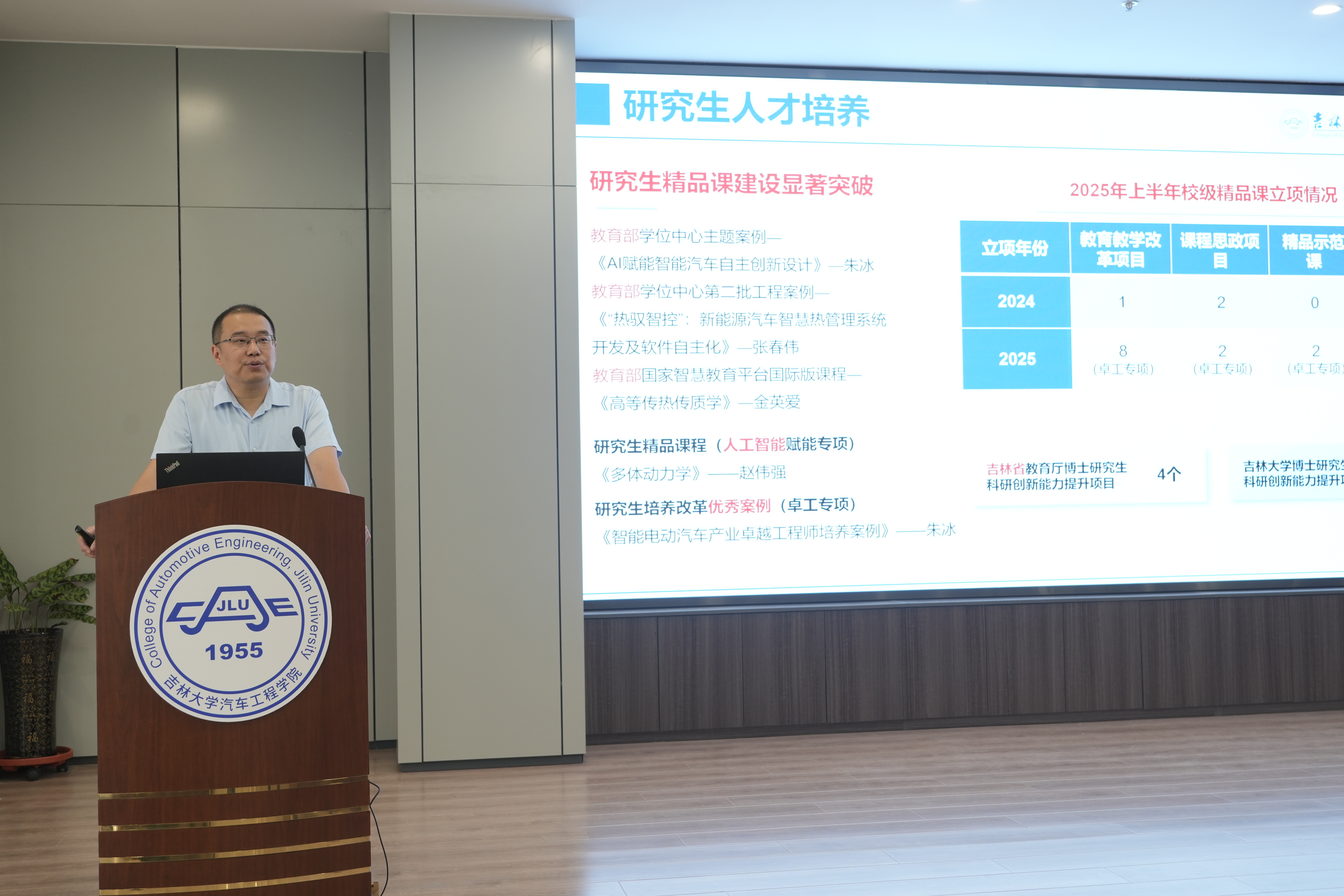经理朱冰从党建工作、队伍建设、人才培养、团队建设、科研与实验室管理、员工工作、员工工作、国际合作以及行政管理等多个方面,系统总结了上半年公司取得的显著成绩,并立足“数智汽车时代,吉大汽车何为”这一命题,对新学期重点工作进行了周密部署。针对年度核心任务——学科70周年庆典,朱冰详细介绍了系列庆祝活动安排,强调“院庆不仅是‘庆生’,更是‘凝心聚力’”。他呼吁全体教师以主人翁姿态积极投身于宣传动员、环境美化、员工联络与捐赠对接等工作中,共同努力打造一场有战略高度,有人文关怀,有思想深度的庆典,让“吉大汽车人”的声音传得更远、更响。