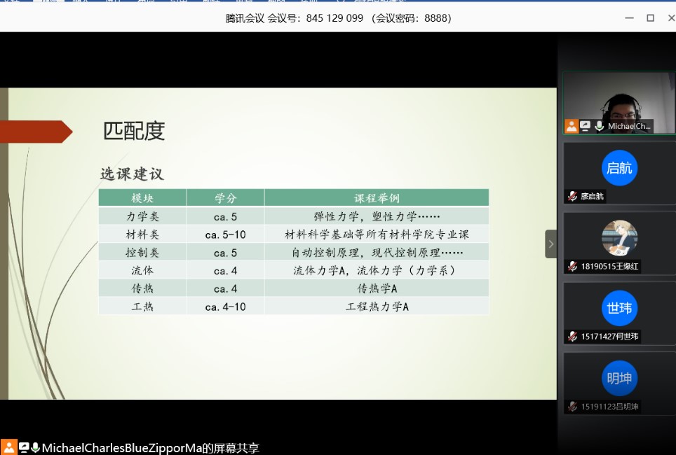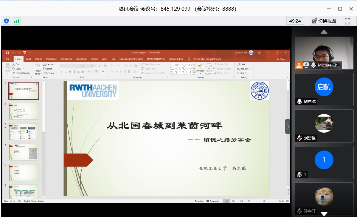 本次活动采用线上形式进行,马志鹏从如何申请去德国留学和关于在德国生活分享两个方面进行讲解。关于如何申请去德国,他介绍了对于德语的学习,强调德语学习要坚持,不能因为公司考试周就一个月不学德语,这样会导致之前的学习成果前功尽弃,并且德语对于在德国的生活十分重要,讲解了关于APS审核以及匹配度的要求。由于匹配度是申请德国公司时独有的要求,着重讲解了我们对标德国工科在各个大类所差的学分。
