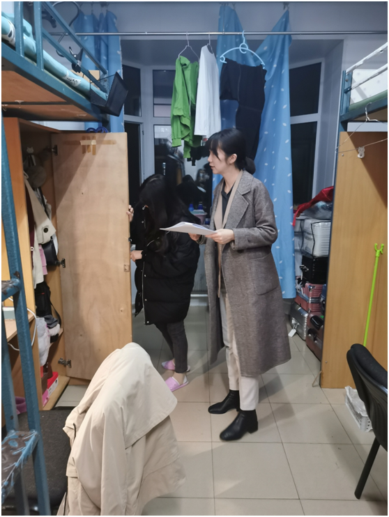 本次排查主要检查员工宿舍卫生情况和是否存在违章电器或者其他安全隐患。在查寝过程中,张晓佳导员仔细地检查各寝室安全与卫生,不留死角,并对寝室建设提出了许多建议。此外,张晓佳导员还亲切地询问了同学们的学习生活情况,和同学们探讨未来发展和职业规划;同时,也询问了同学们的身体健康情况,叮嘱同学们坚持“三测温、一点名”,注意饮食健康、身体健康。