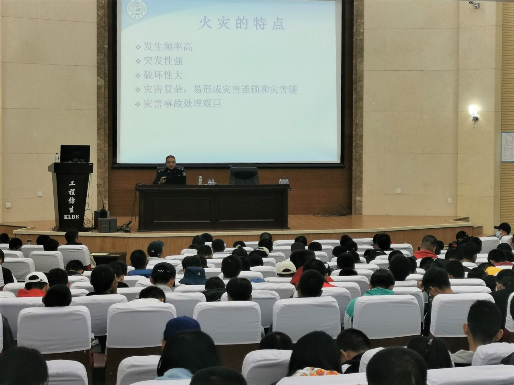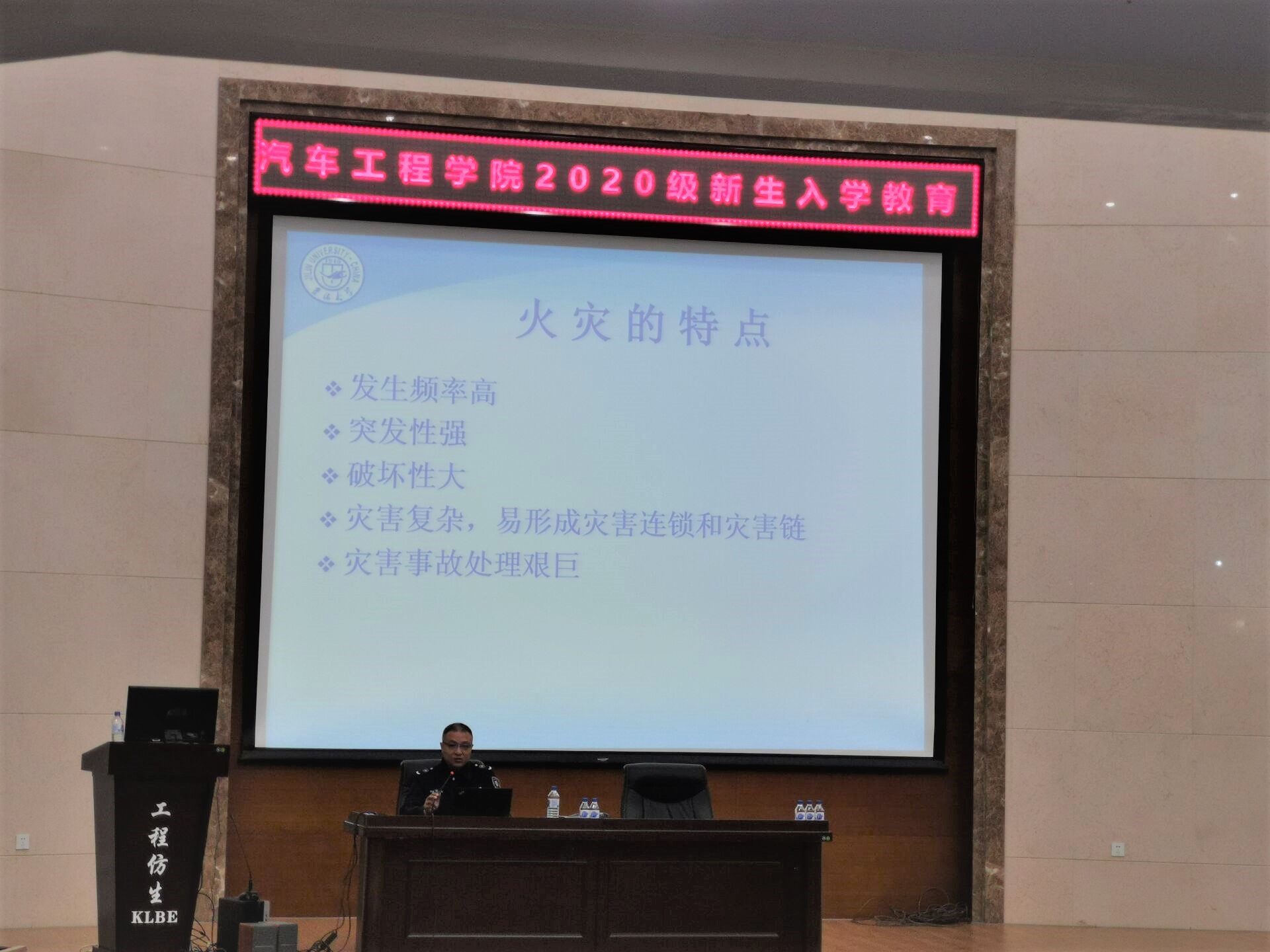 上午十点,2020级汽院新生在仿生楼报告厅就坐,安静等待聆听老师的发言。主讲人韩旭老师以防火消防为主题,结合PPT,图文并茂,并列举生活中的实例和过去的火灾新闻,告诉同学们防火意识的重要性和校园生活中应当注意的事项。讲座内容注重防火意识宣传及寝室中违禁物品的介绍,并强调禁止使用违章电器,为新同学敲响警钟,把好寝室防火第一关。