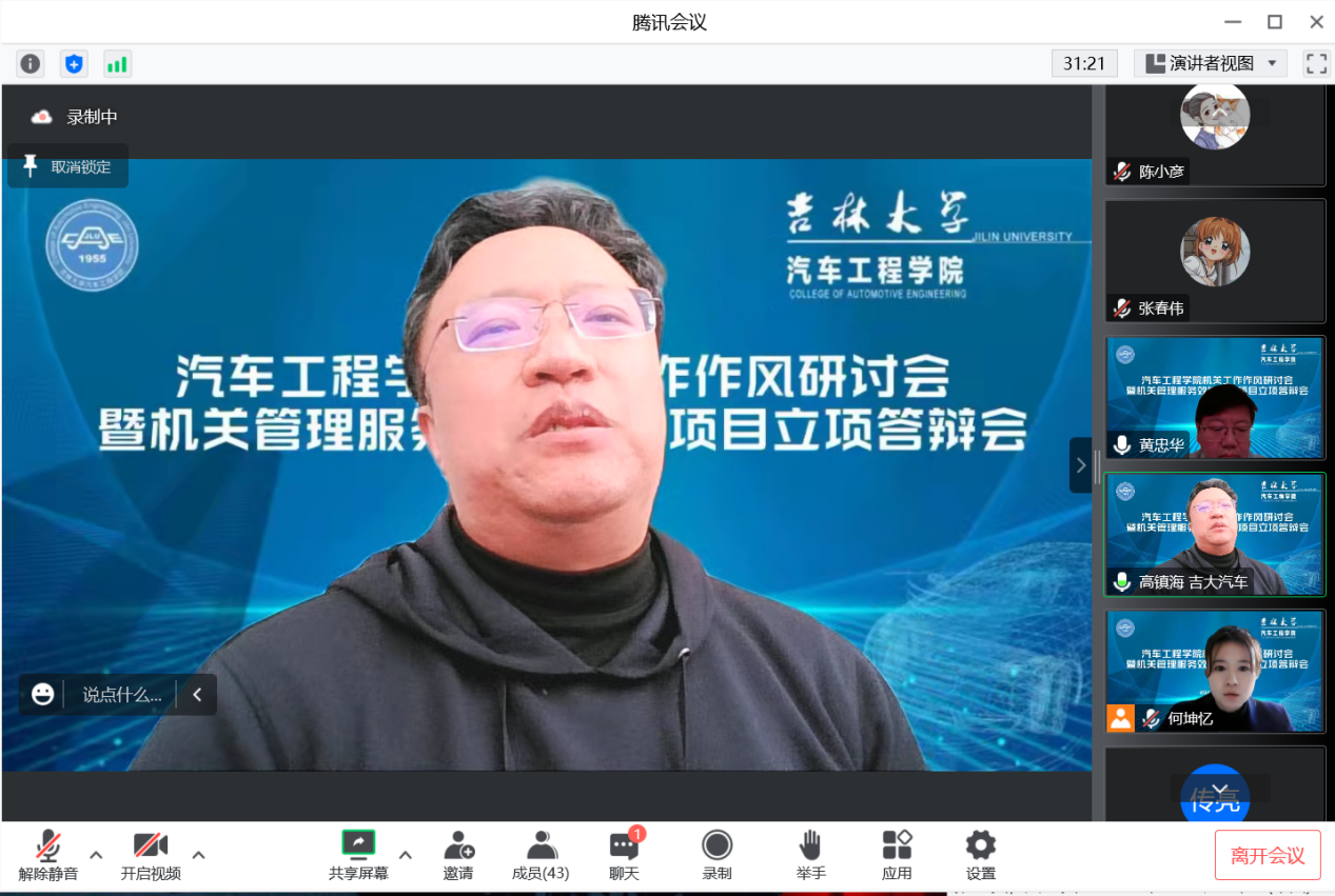 2022年12月1日上午,云顶7610线路检测机关工作作风研讨会暨机关管理服务效能提升项目立项答辩会成功举行。云顶7610线路检测、汽车仿真与控制国家重点实验室领导班子成员,各系所主任、教师代表,机关各科室全体工作人员等50余人参加了会议。会议由党委书记黄忠华主持。