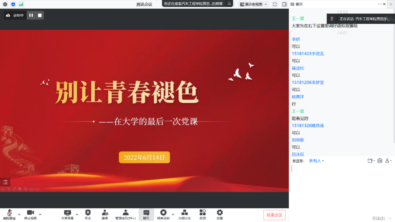为教育和引导全体毕业生自觉增强党员意识、勇挑重担,充分发挥党员的引领示范作用,今后在各行各业努力成为楷模和榜样,6月14日下午,公司举行了以“别让青春褪色”为主题的毕业生最后一次党课。受疫情影响,本次活动通过腾讯会议在线上举行。公司党委书记黄忠华、公司相关科室老师及2022届本科毕业生党员参加了本次活动。活动由2018级本科辅导员李娇老师主持。